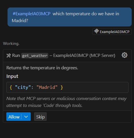 Para el escenario de hoy simplemente vamos a ejecutar nuestra tool, para ello la debemos de llamar (debemos de sabernos el nombre de dicha tool) y enviar los parámetros necesarios, que en nuestro caso es únicamente la ciudad.